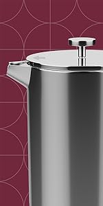 The professional grade carafe’s stainless steel handle stays cool so you can easily grasp it when pressing the plunger down or when pouring coffee into a coffee mug or cup.
